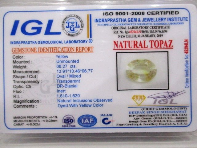 8.27 carat 9.25 ratti IGL certified natural Indian oval shape yellow topaz stone