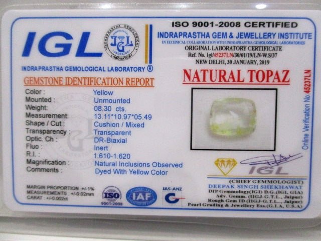 8.3 carat 9.25 ratti natural IGL certified Indian cushion shape yellow topaz stone