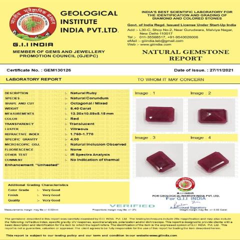 8.4 Carat 9.24 Ratti Natural GII Certified Mozambique Octagon shape red Ruby Gemstone