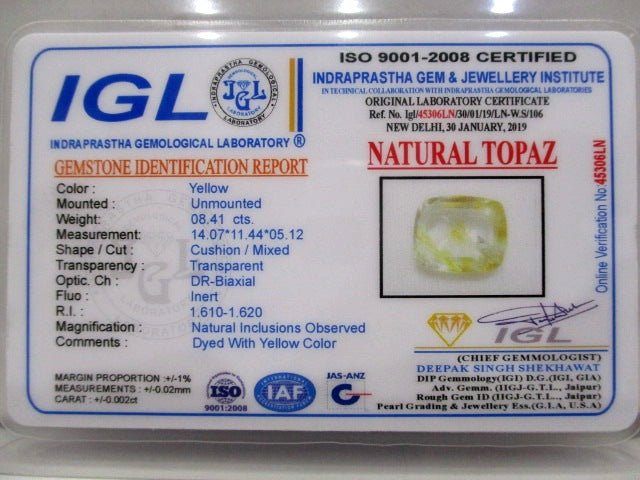 8.41 carat 9.25 ratti IGL certified natural Indian cushion shape yellow topaz stone