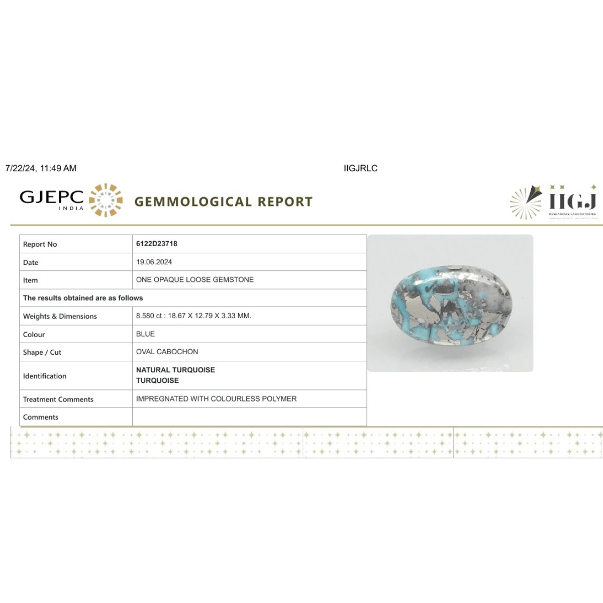 8.58 carat 9.44 ratti IGI-GTL certified AAA+ Quality Blue with golden Bisbee oval Turquoise (Firoza) Stone