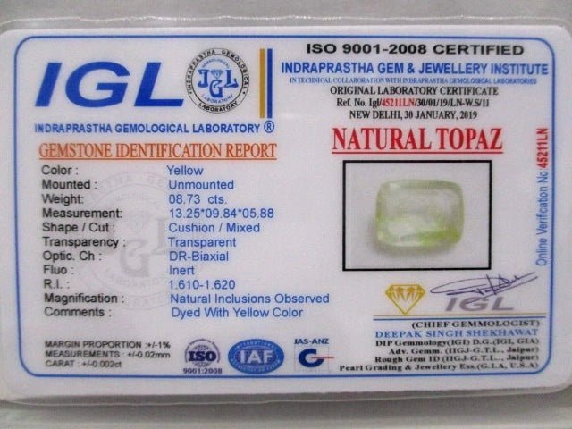 8.73 carat 9.6 ratti natural IGL certified Indian cushion shape yellow topaz stone