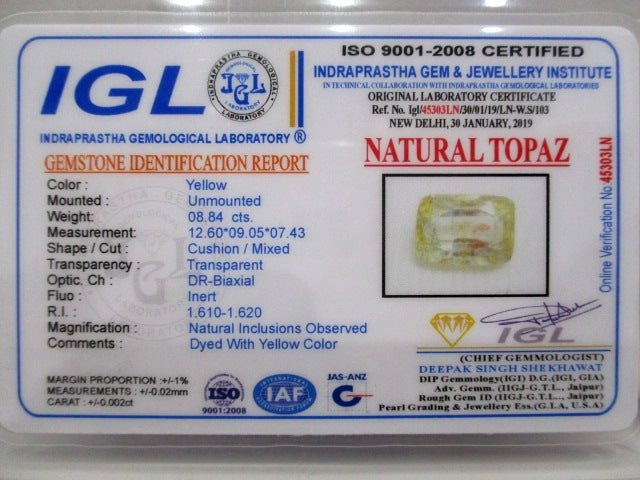 8.84 carat 9.72 ratti IGL certified natural Indian cushion shape yellow topaz stone