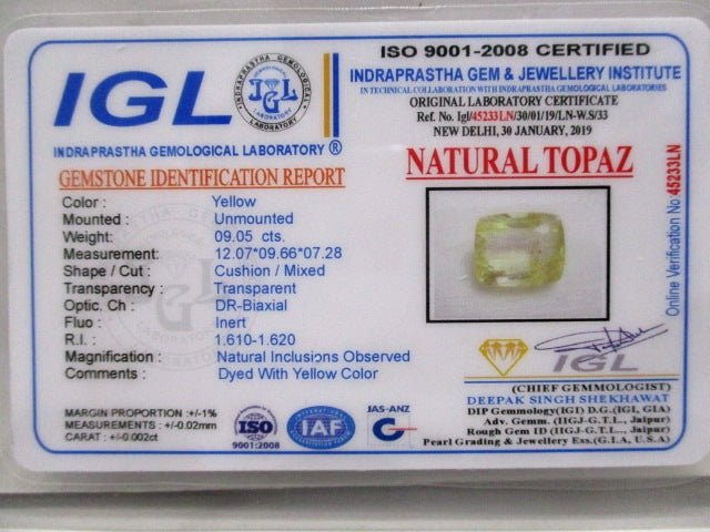9.05 carat 10 ratti natural IGL certified Indian cushion shape yellow topaz stone