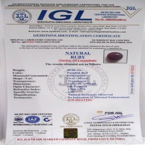 9.06 Carat 10 Ratti Natural IGL Certified Mozambique Oval shape Purplish-red Ruby Gemstone
