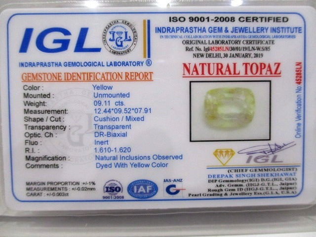 9.11 carat 10.02 ratti natural IGL certified Indian cushion shape yellow topaz stone