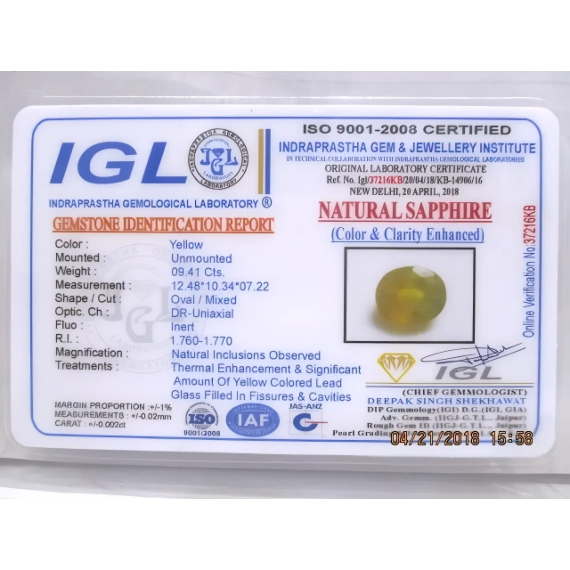 9.41ct Genuine Yellow Sapphire (Heated & treat) – Bangkok Origin – Lustrous & Elegant