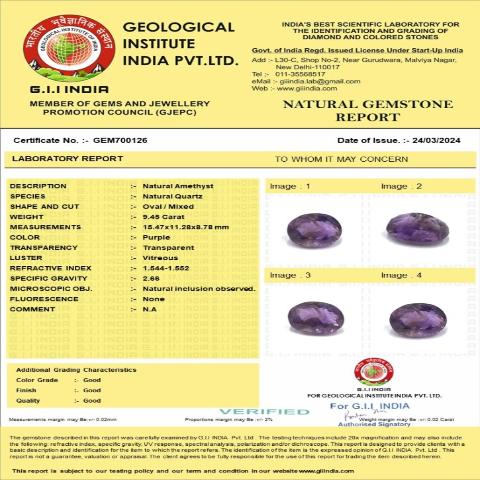 9.45 carat 10.4 ratti GII certified Natural American Oval Shape Amethyst Stone
