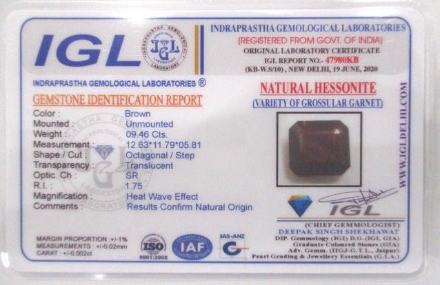 9.46 Carat 10.41 Ratti IGL Certified Natural Ceylon (Sri Lanka) Octogonal shape Hessonite (Gomed) Gemstone