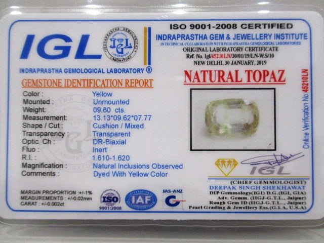 9.6 carat 10.56 ratti natural IGL certified Indian cushion shape yellow topaz stone