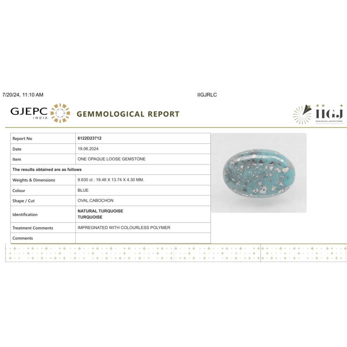9.63 carat 10.59 ratti IGI-GTL certified AAA+ Quality Blue with golden Bisbee oval Turquoise (Firoza) Stone