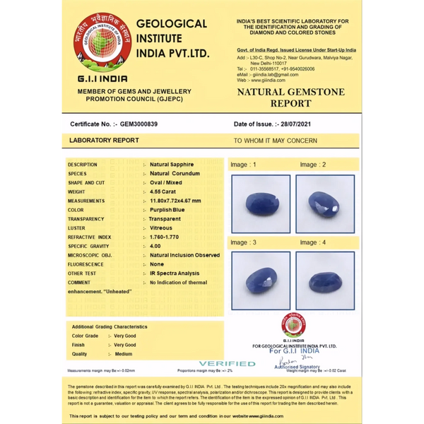 Buy Certified Natural Ceylon Blue Sapphire Untreated, Unheated by Carat 4.55 carat