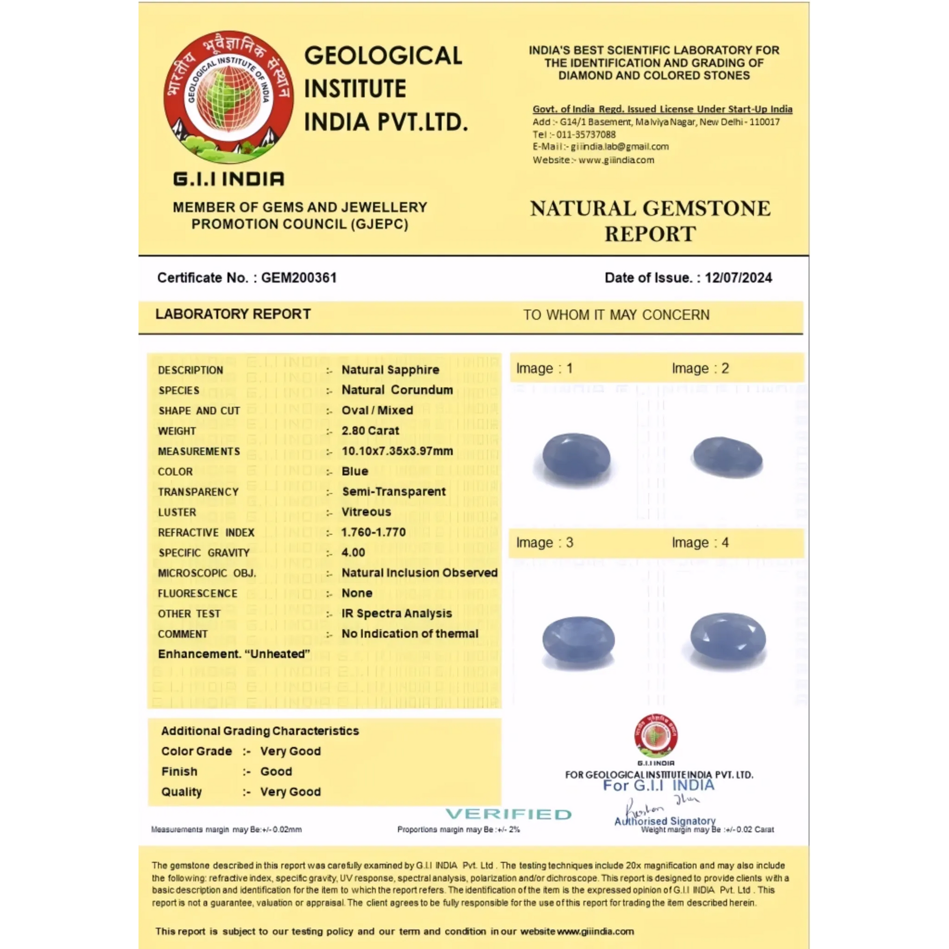 Ceylon Blue Sapphire Unheated & Untreated 2.8 carat Oval Shape Certified