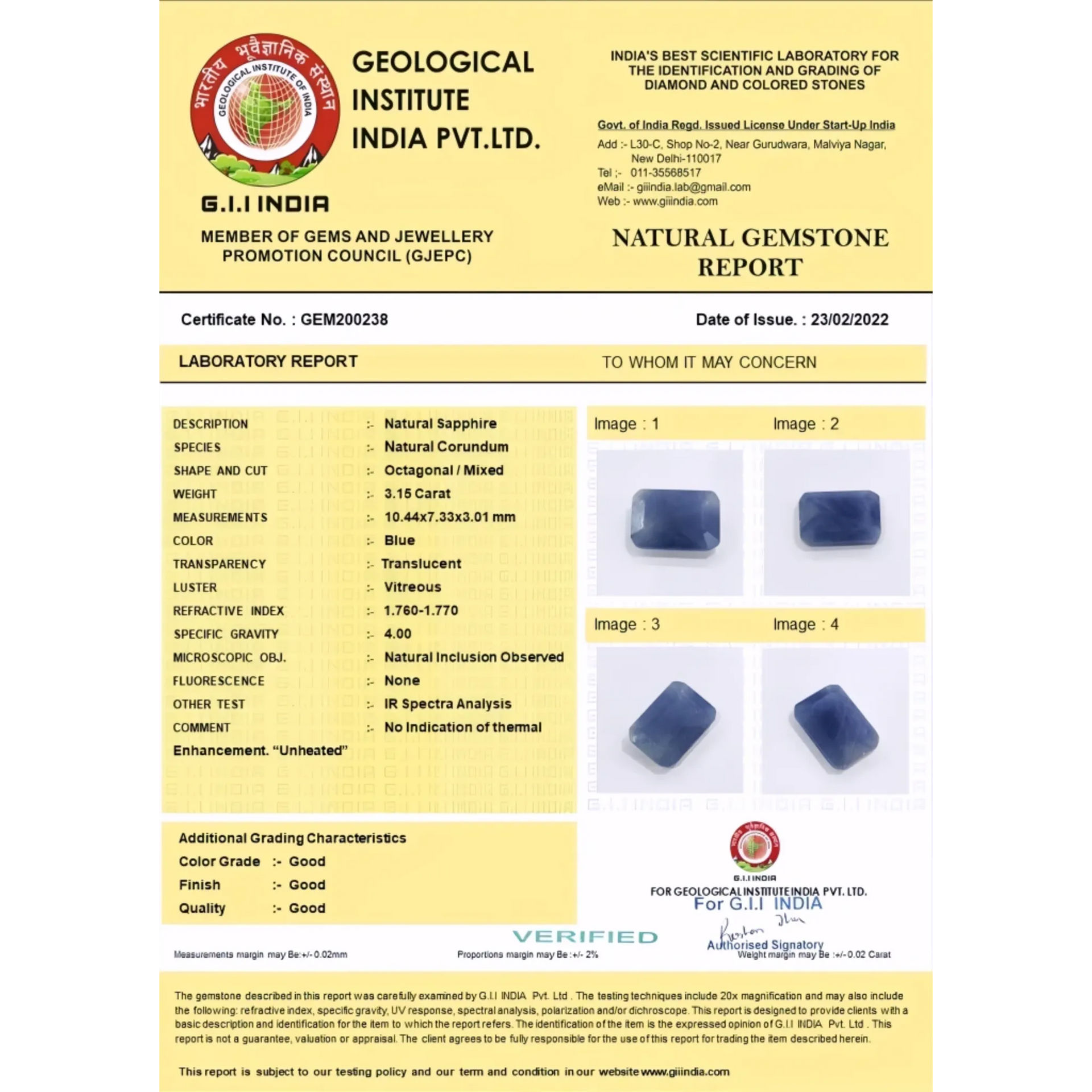 Ceylon Blue Sapphire Unheated & Untreated 3.15 carat Octagon Shape Certified