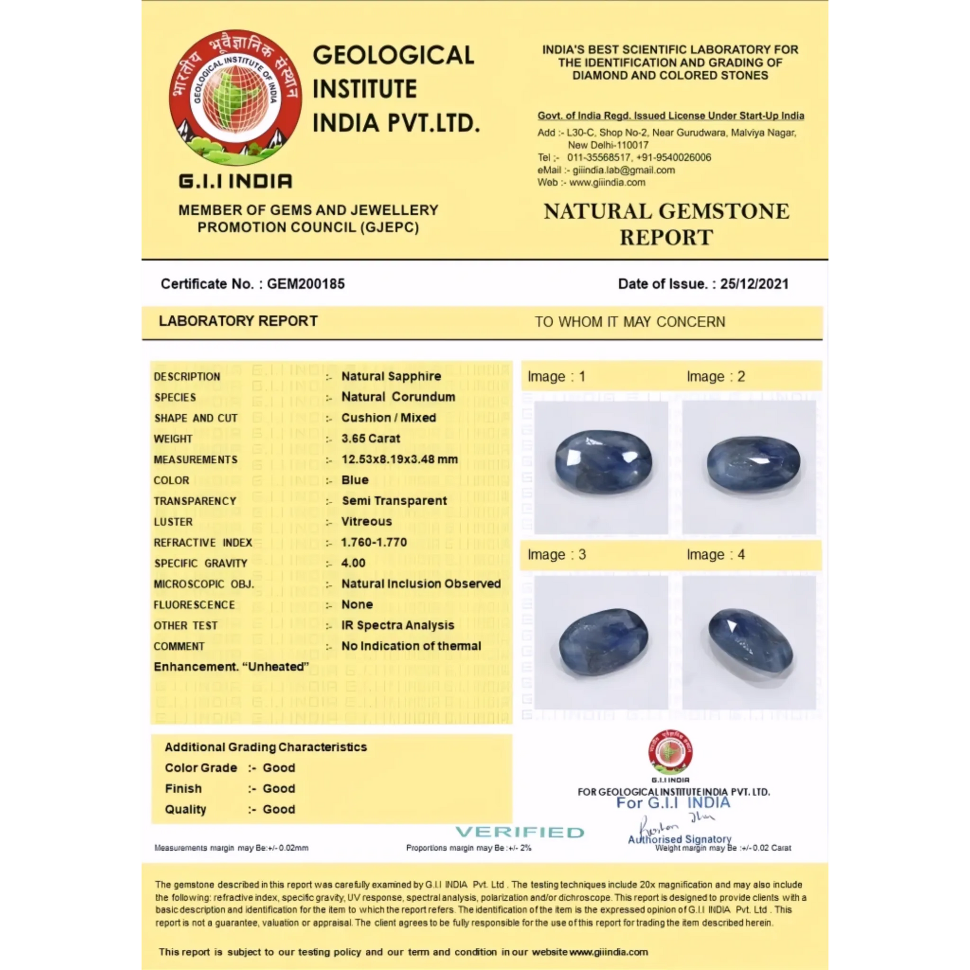Ceylon Blue Sapphire Unheated & Untreated 3.65 carat Cushion Shape Certified