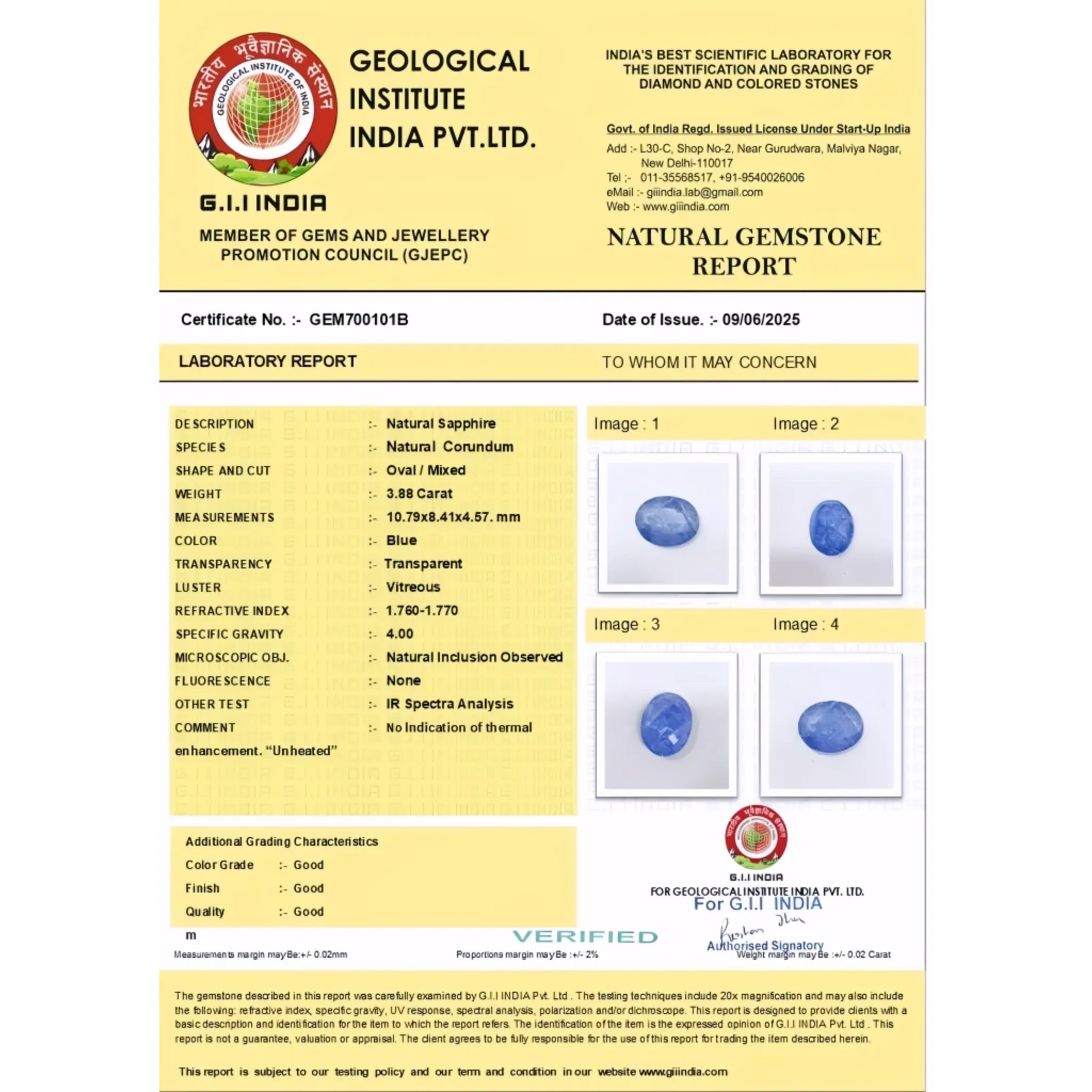 Ceylon Blue Sapphire Unheated & Untreated 3.88 carat Oval Shape Certified