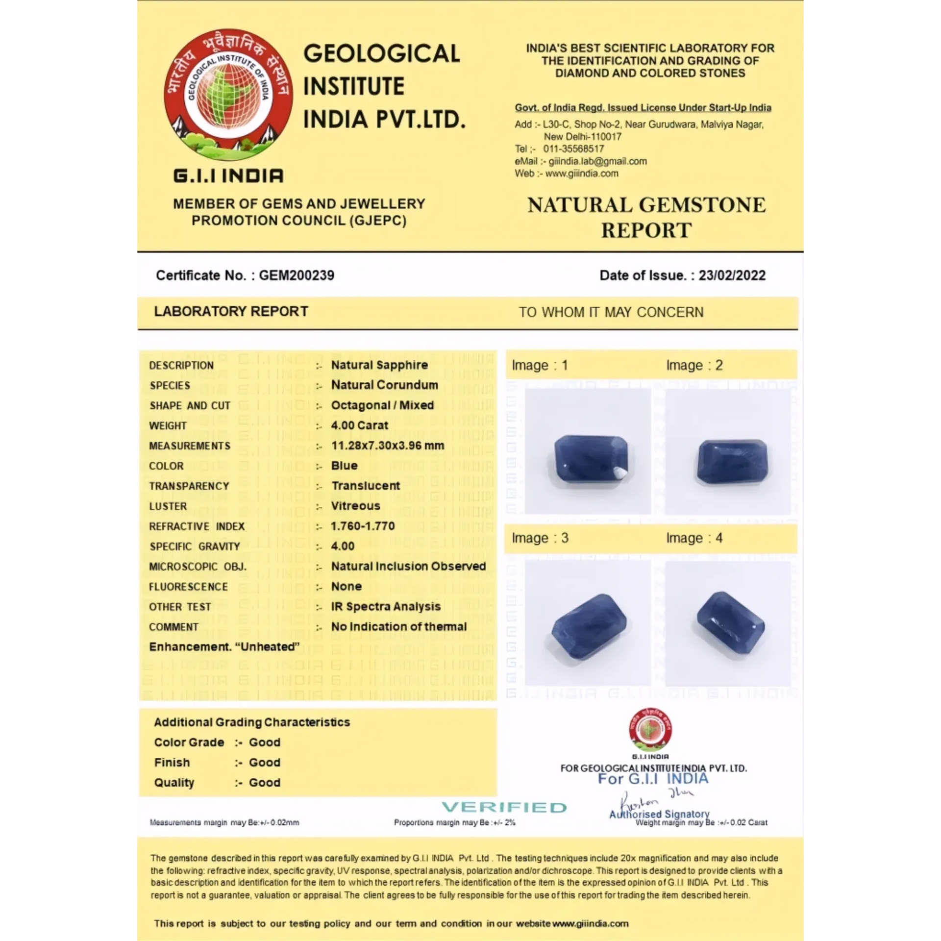 Ceylon Blue Sapphire Unheated & Untreated 4.00 carat Octagon Shape Certified