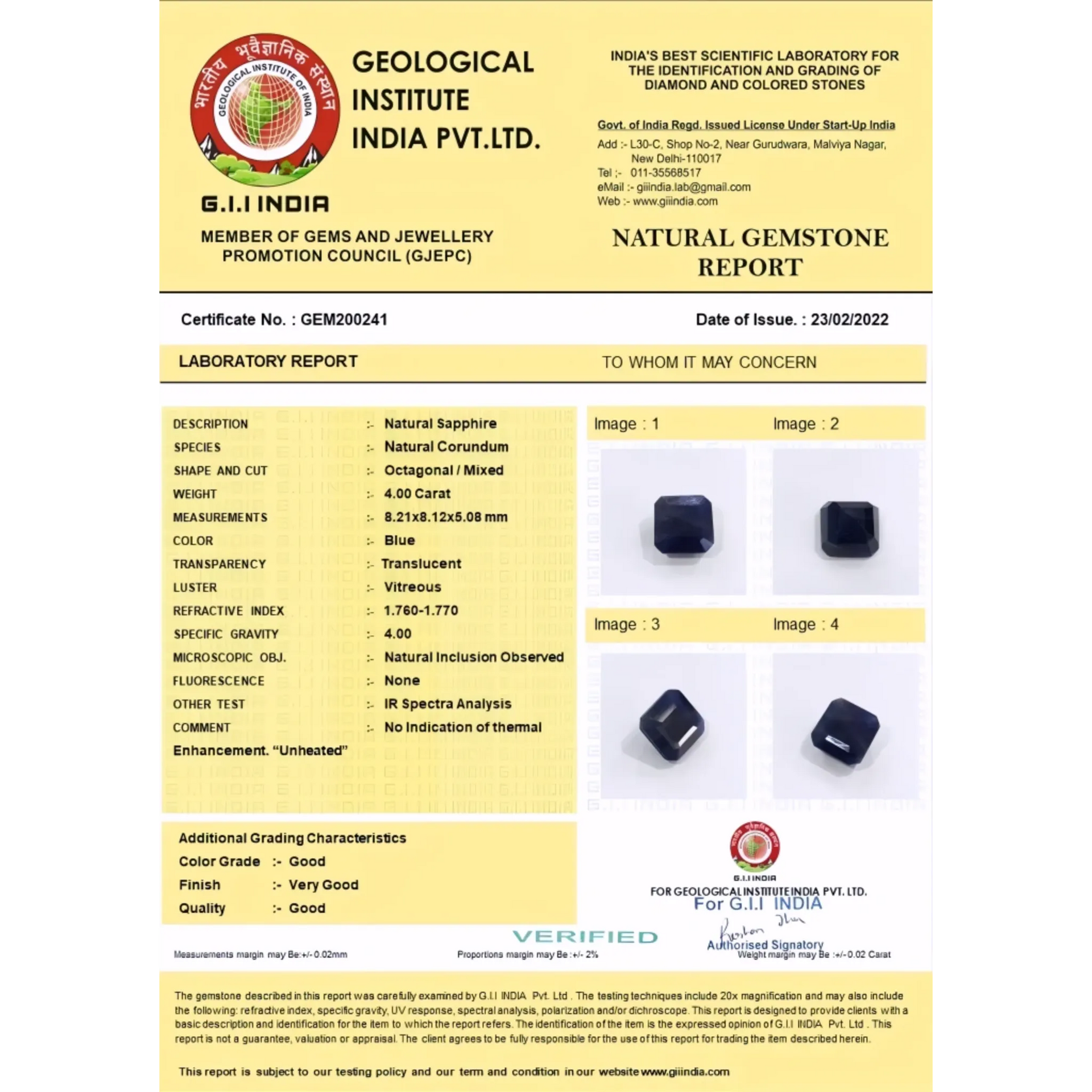 Ceylon Blue Sapphire Unheated & Untreated 4.00 carat Octagon Shape Certified