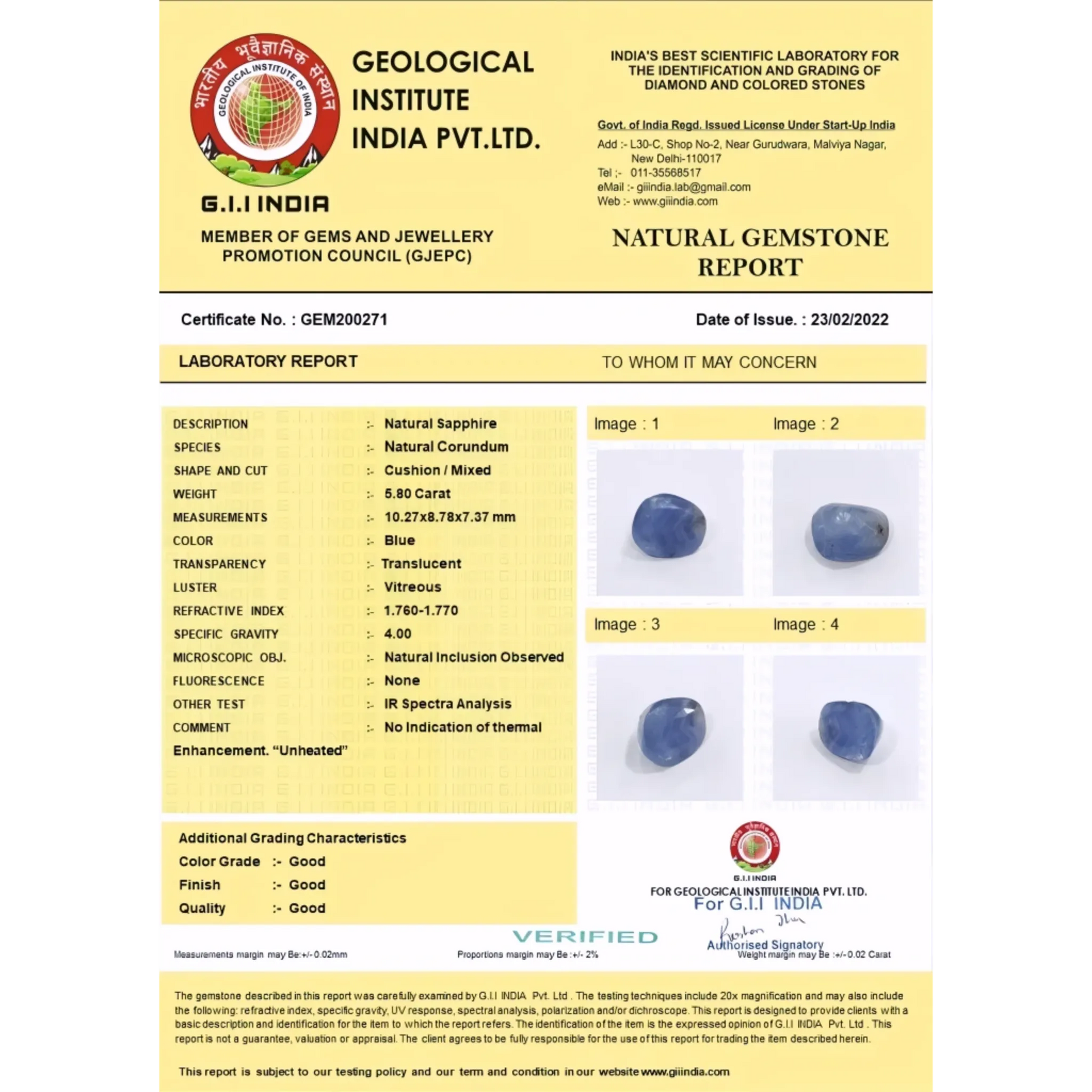 Ceylon Blue Sapphire Unheated & Untreated 5.8 carat Cushion Shape Certified