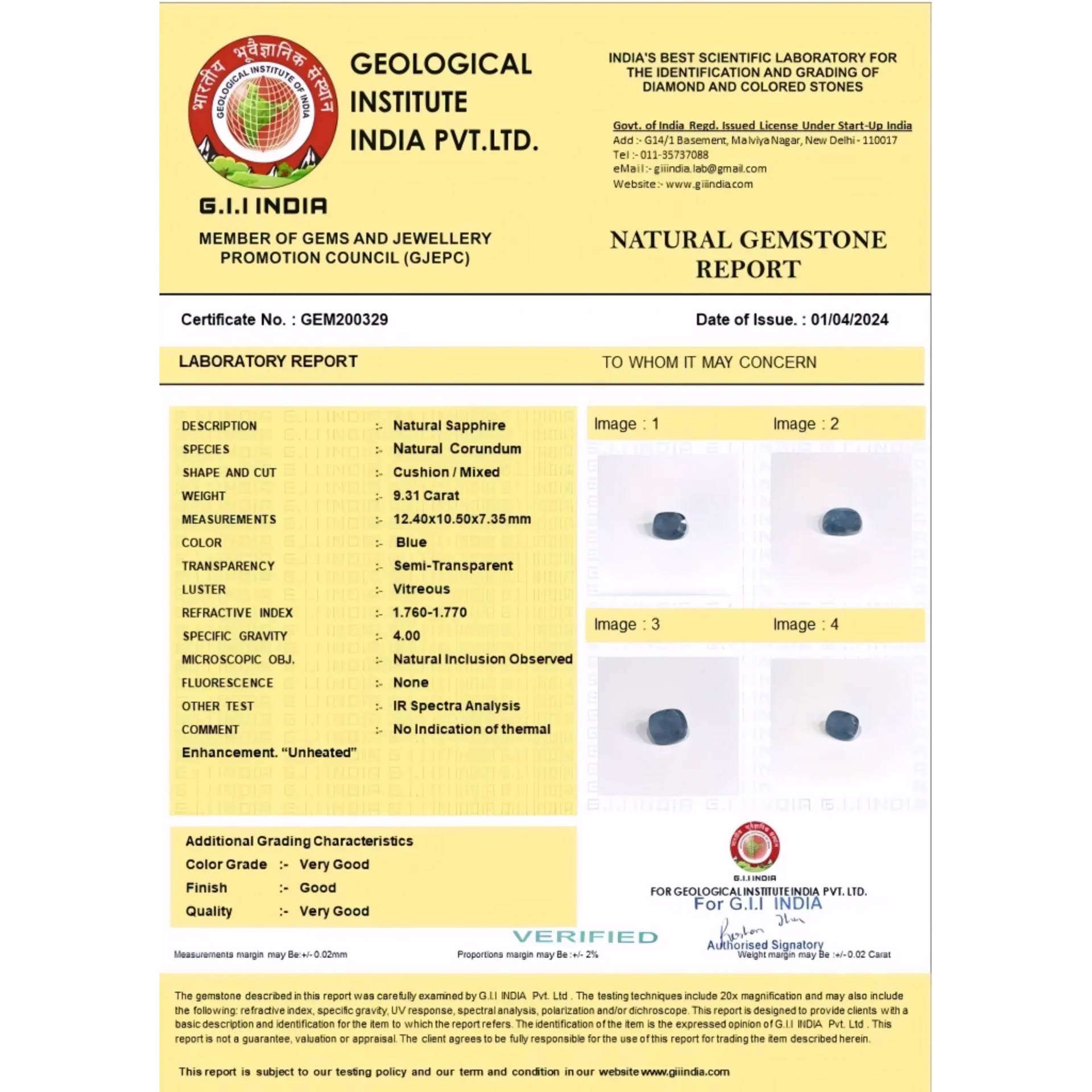 Ceylon Blue Sapphire Unheated & Untreated 9.31 carat Cushion Shape Certified