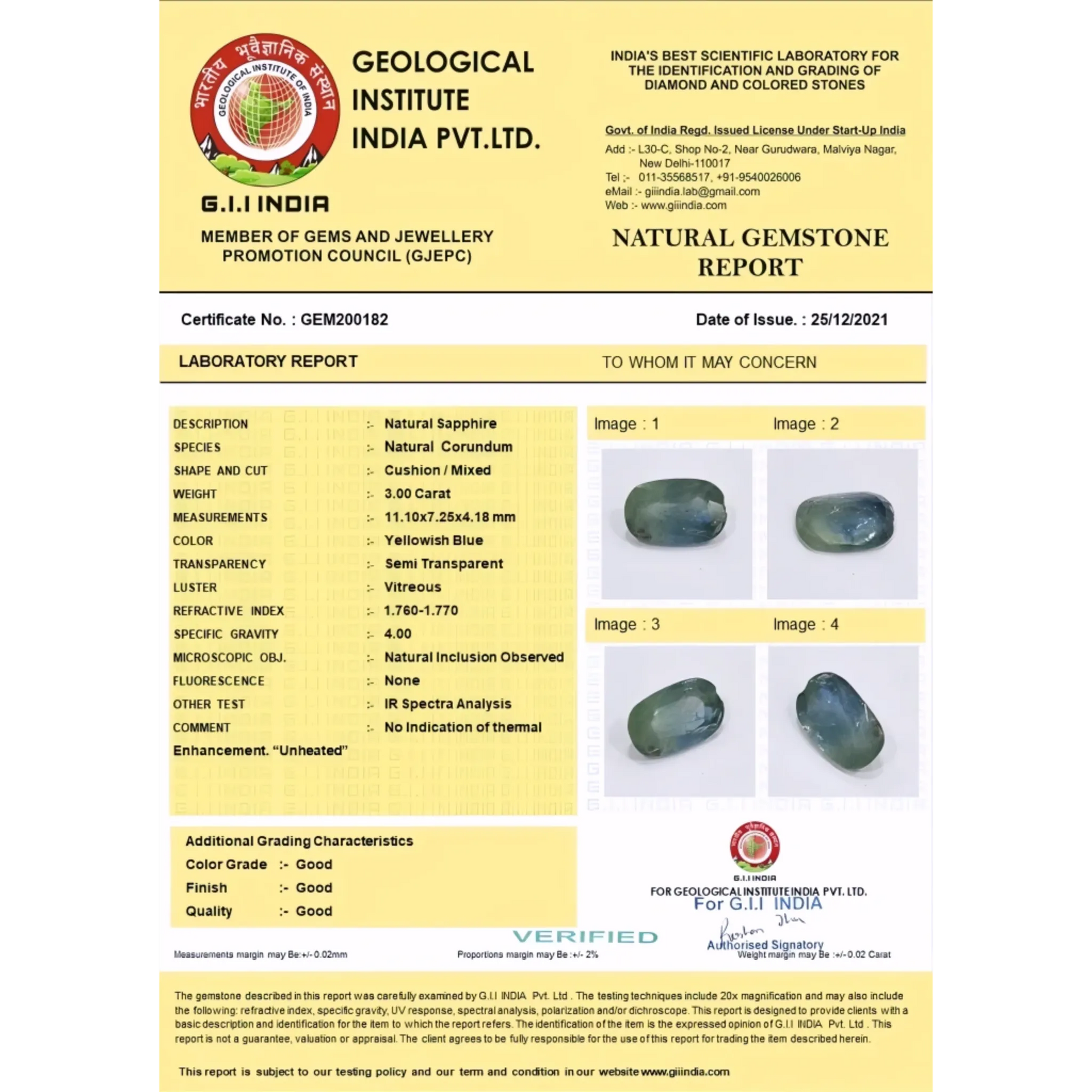 Ceylon Pitambari Unheated & Untreated 3.00 carat Cushion Shape Certified