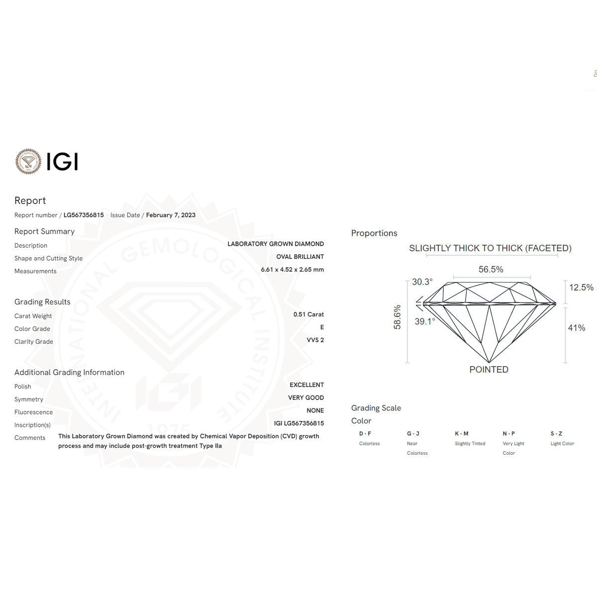 Enchanting and versatile, this 0.51ct E,VVS2 Oval Shape Lab Grown Diamond can be paired with a variety of metal settings, such as platinum or gold, to create a unique and personalized piece of jewelry. Whether it adorns an engagement ring, necklace, or any other cherished accessory, this diamond is sure to make a lasting impression and become a symbol of both style and sustainability.