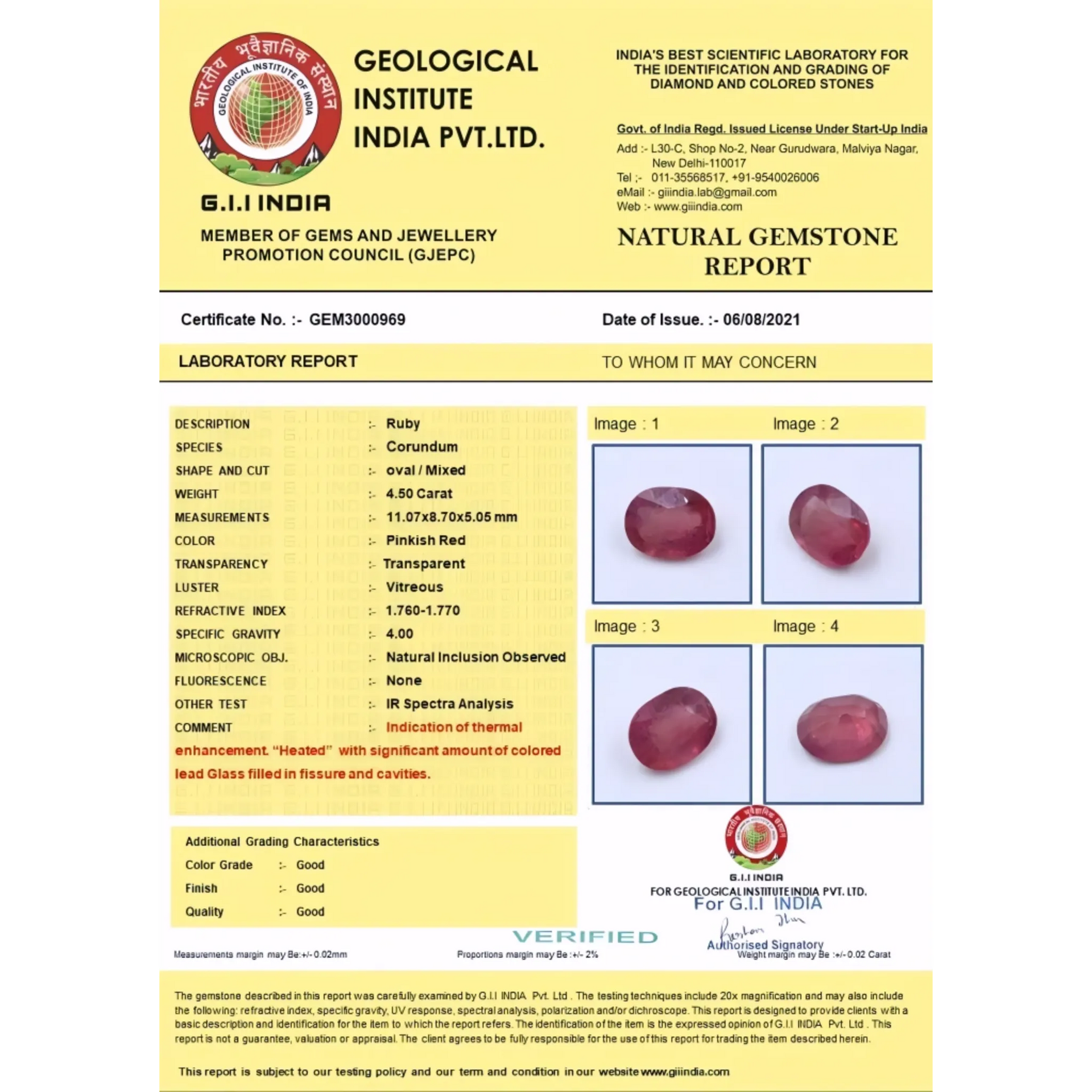 GII certified 4.5 carat heated treated Bangkok Ruby