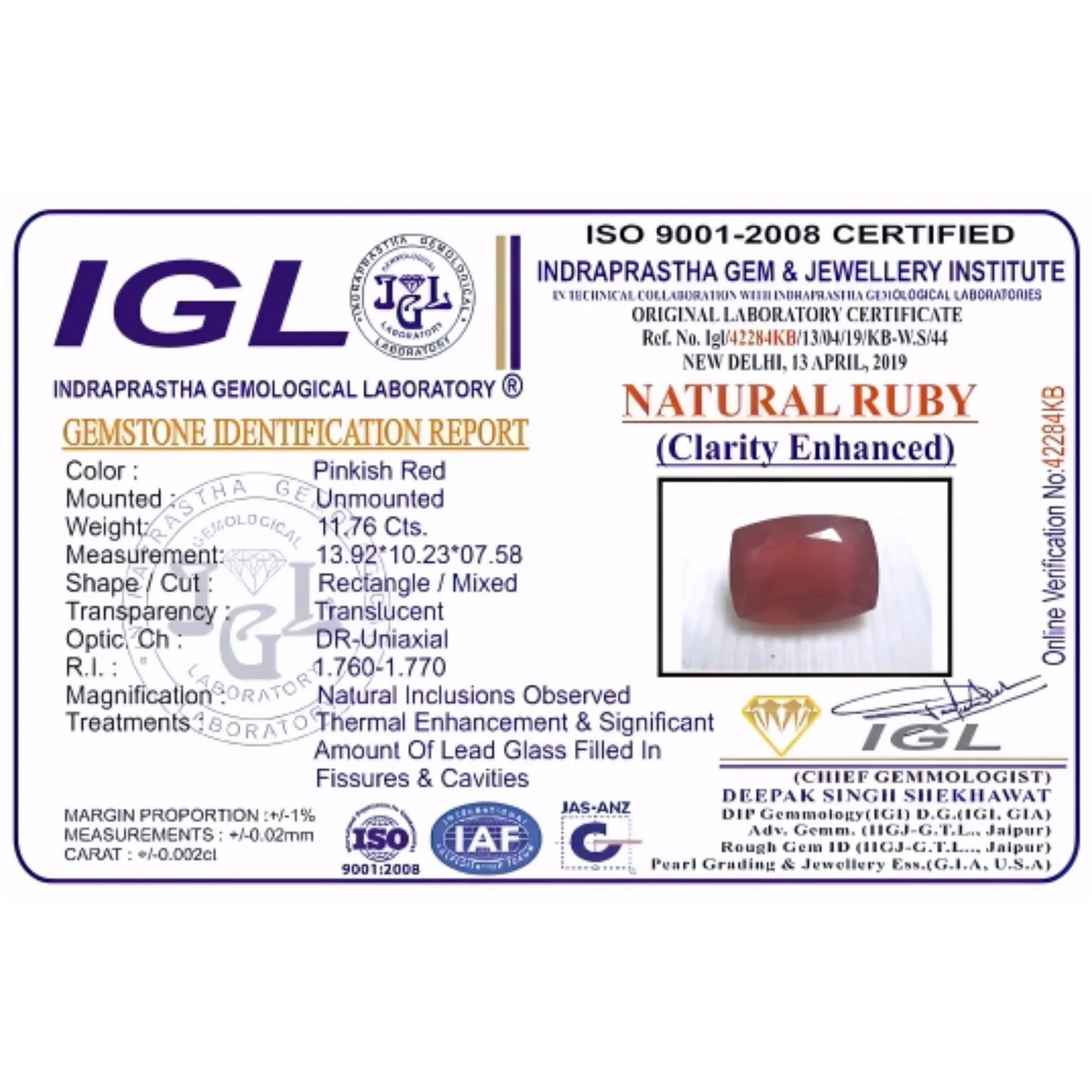 IGL certified 11.76 carat heated treated Bangkok Ruby