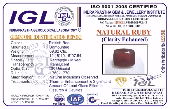 IGL certified 9.82 carat heated treated Bangkok Ruby
