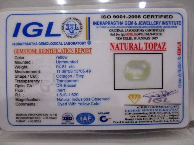 4.81 carat 5.29 ratti natural IGL certified Indian Octagon shape yellow topaz stone