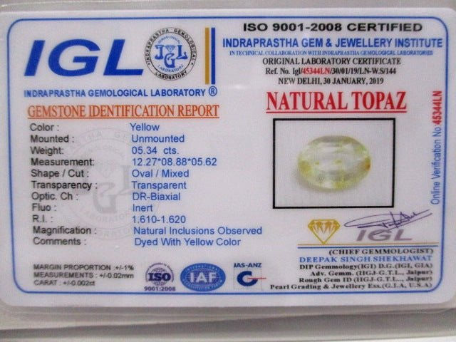 5.34 carat 6 ratti natural IGL certified Indian Oval shape yellow topaz stone