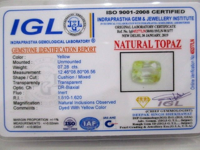 7.28 carat 8.01 ratti natural IGL certified Indian Cushion shape yellow topaz stone