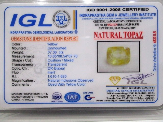 7.36 carat 8.25 ratti natural IGL certified Indian Cushion shape yellow topaz stone